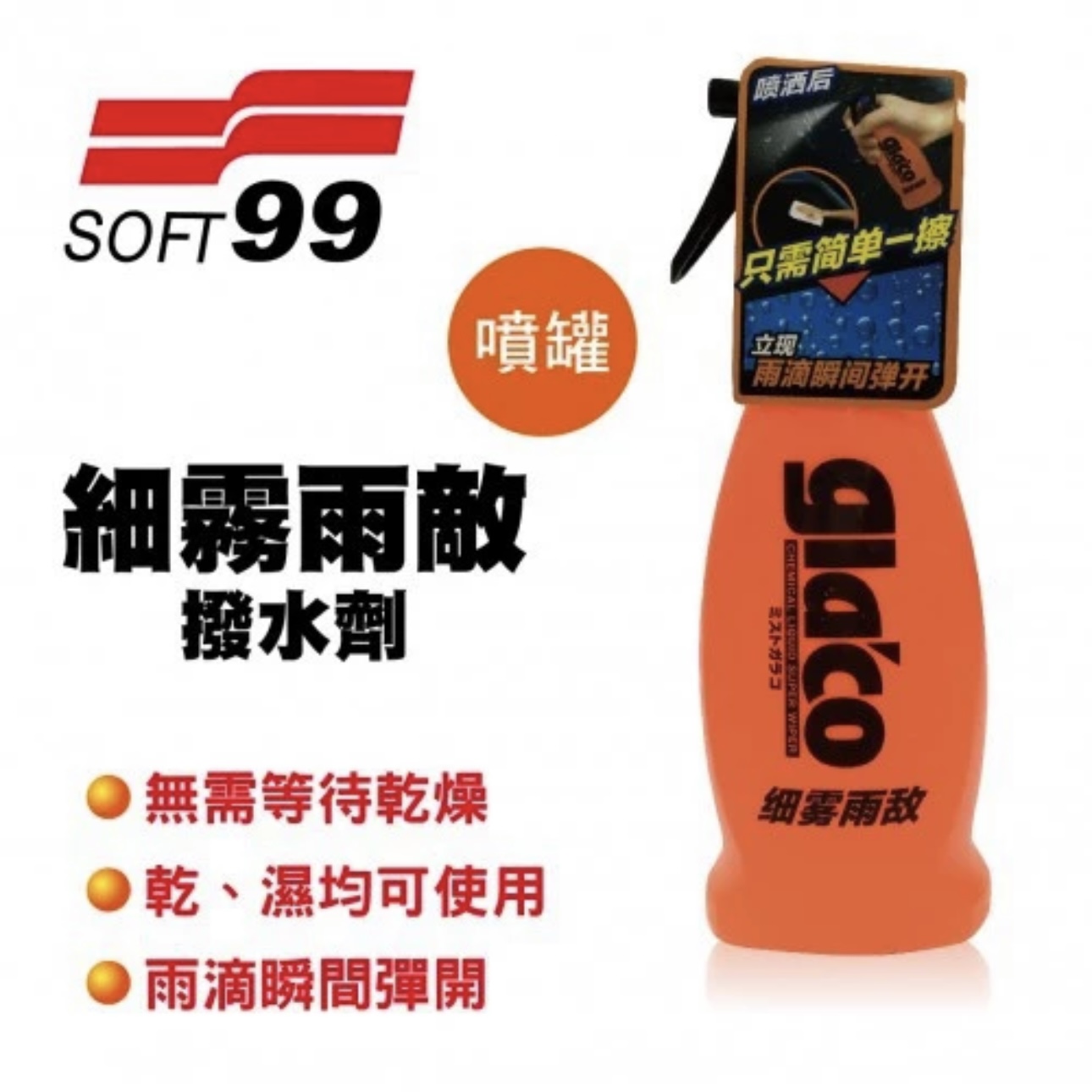 與現有商品相比較大大簡化了操作,但依然保留了超強撥水的新型""雨敵""。無需塗抹,乾燥,只需噴灑在擋風玻璃之上,即可發揮不亞於塗膜型的功效。洗車後打濕的玻璃使用也OK。玻璃上有水滴殘留也可以使用。可在10台中型車的擋風玻璃上使用。