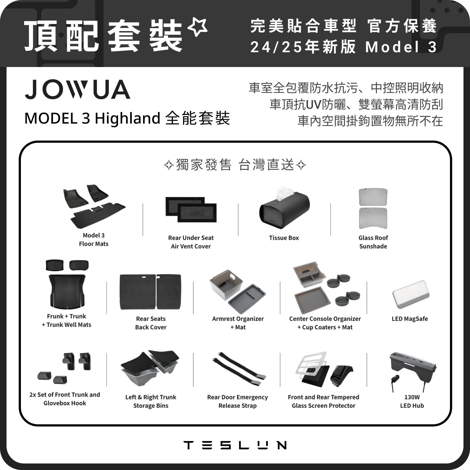 🔥熱賣🔥 teslun hk x JOWUA Tesla Model 3 highland 2024+ 新車推薦套裝(標準套裝) 1. Jowua Model 3 (2024+) 立體防水腳踏墊(右軚)(原價$1,768) 2. Jowua Model 3 (2024+) 立體防水行李廂墊套裝(原價$2,199) - Jowua 立體防水行李廂墊 - Jowua 後座椅背墊 - Jowua 行李廂側儲物盒 (一組兩入) 3. Jowua Model 3 (2024+) MagSafe 皮革灰色面紙盒(原價$209) 4. Jowua 中控收納組 (3件產品)(原價$319) - Jowua 中控前後排矽膠水杯墊 (一組兩入) (灰色) - Jowua 中控收納盒 (灰色) - Jowua 中控收納下矽膠底墊 (灰色) 5. Jowua 扶手箱收納組合 (灰色)(原價$279) - Jowua 扶手箱下矽膠底墊 (灰色) - Jowua 扶手箱收納盒 (灰色) 6. Jowua 椅下出風口防水保護網(原價$159) 7. Jowua 玻璃車頂遮陽簾 - 原廠灰/黑武士(原價$869) 8. Jowua 前排手套箱掛鉤(原價$159) 9. Jowua 前備箱行李廂掛鉤(原價$159) 10. Jowua 便攜式LED燈 (支援MagSafe無線充電)(原價$236) 11. Jowua 130W LED Hub 中控擴充座(原價$549) 12. Jowua 反光後門緊急拉繩(原價$180) 13. Jowua 強化玻璃螢幕保護貼 - 磨砂/高清(原價$319) ✨包含18件Model 3 highland 新車必推好物✨ ✨✨套裝總值超過$7,404✨✨ 台灣品牌🇹🇼JOWUA ✅ 24-26年Model 3 highland 適用 ✅ 安裝簡單 ✅ 外形美觀 ✅ 官方保養 * 下單時標註新車型號/收貨日期 * 下單後會有專人 Whatsapp 聯絡確認訂單及款式 * 此套裝無法投放智能櫃,下單請填寫送貨地址