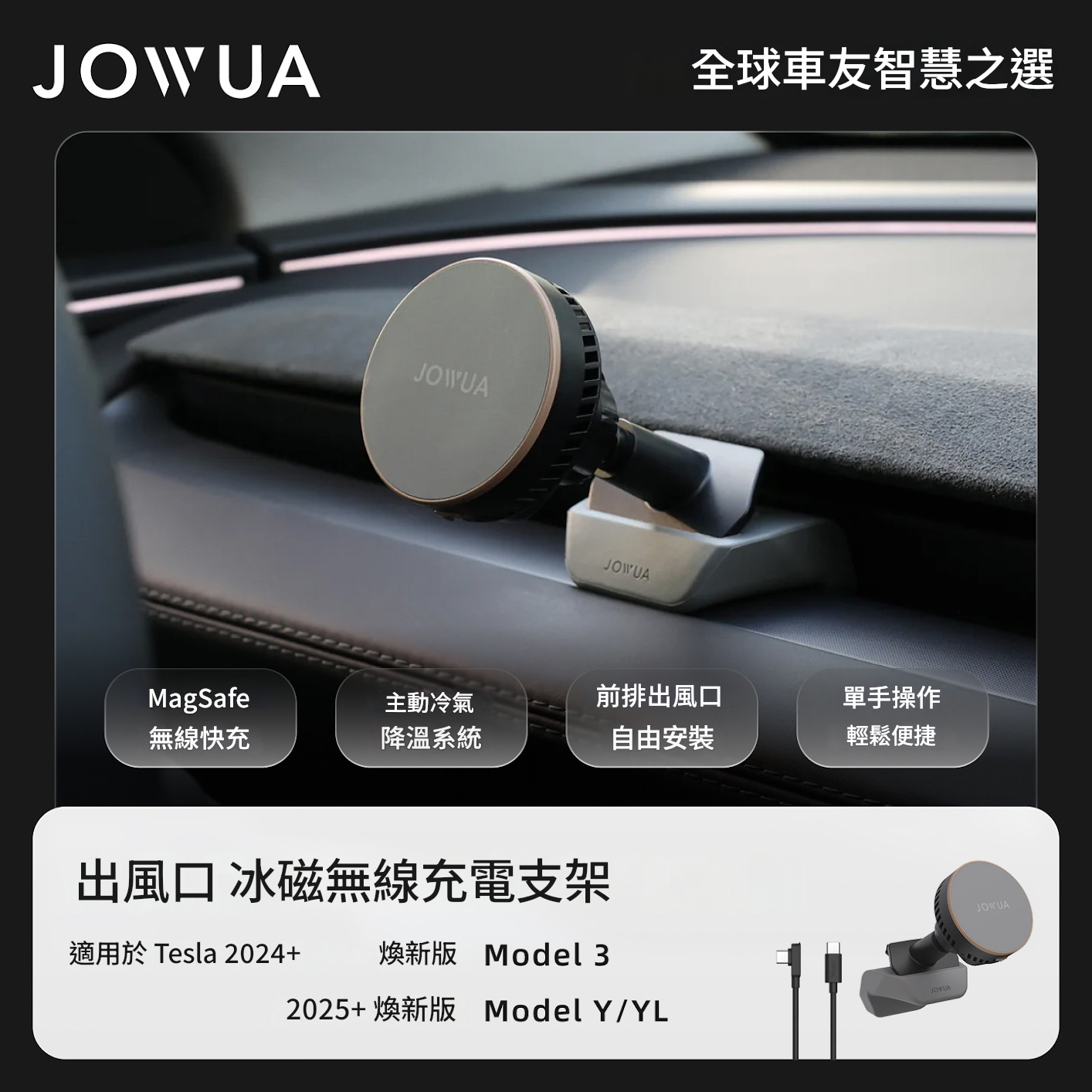 為達Qi2 製冷無線充電車架之最佳充電效能,需請使用30W (15V/2A) 功率之充電配件