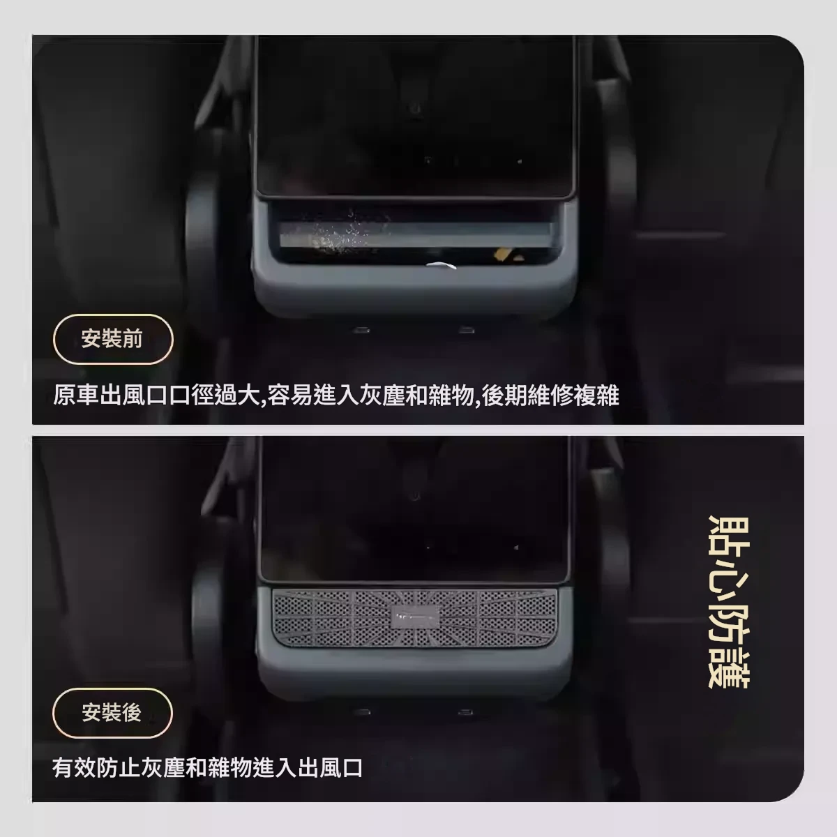 由 TPARTS 設計 Model 3(2024+) / Model Y (2025+) 專用 材質環保無異味可隨時水洗 無損安裝隨心拆卸拆卸時按壓取出即可 安裝前 原車出風口口徑過大,容易進入灰塵和雜物,後期維修複雜 安裝後 有效防止灰塵和雜物進入出風口